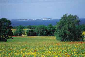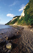 Über blauer See erhebt sich auf steiler, bewaldeter Kreideküste der berühmte Königstuhl - das Wahrzeichen der Insel.