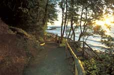 sich um die Hänge im Uferwald vorbei an hohen Buchen mit Blick auf die
